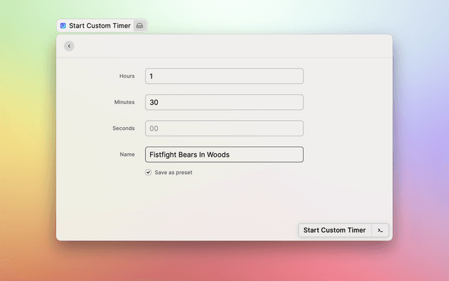 Start, stop, and save countdown timers, directly in Raycast, with no external dependencies.