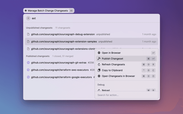 Browse, view, publish, and merge changesets for batch changes straight from Raycast. Batch changes automate large-scale code changes to keep your code up to date, fix critical security issues, and pay down tech debt across all of your repositories.