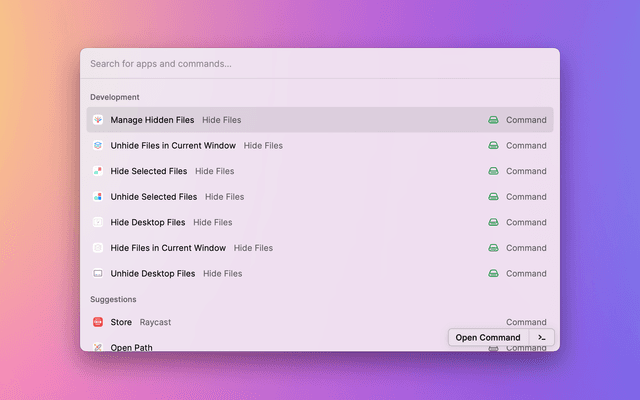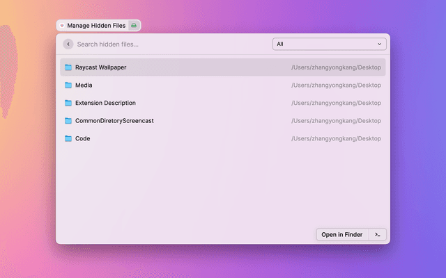 • 🌟🌟🌟But you can always use the shortcut " ⇧+⌘+. " or Raycast build-in Toggle Hidden Files command to see all system hidden files.